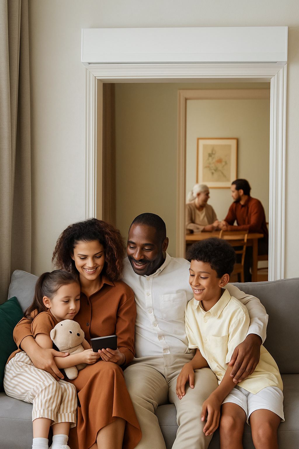 Panel med fläktar monteras ovanför dörröppning. Välj en av 6 hastigheter. Fläktarna flyttar varmluften från taknivå och styr luften ner mot golvet i nästa rum. Jämnare temperatur året runt. På sommaren går samma princip åt andra hållet, värme flyttas bort från rum du vill hålla svalare.